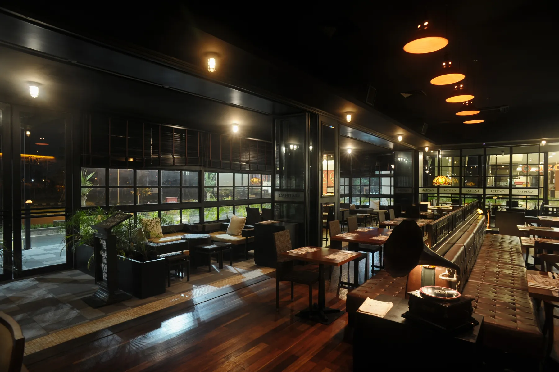 The restaurant is divided into 4 zones; semi outdoor dining area, indoor dining, a private room, and bar with its stunning 12m length granite top bar counter featuring a large mural and a DJ station. A wine display featuring wine crates neatly lined against a rustic metal rack is exhibited amidst the dining area, offering yet another visual attraction while letting the customers easily choose the wine. A careful application of lighting enhances a dramatic yet cozy ambiance throughout the space. The stretch of metal framed window along the facade allows a fusion of daylight into the interior while presenting an unobstructed view of the outside.