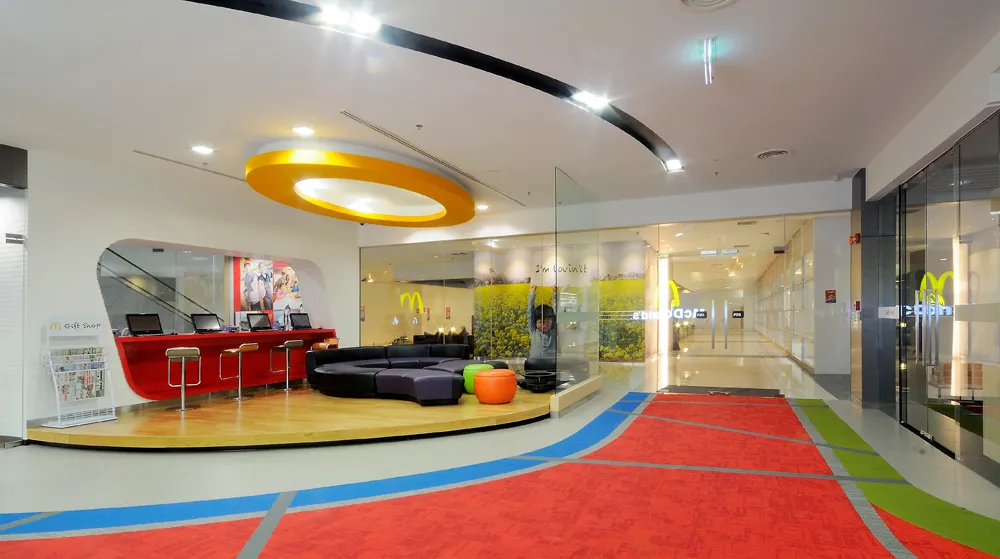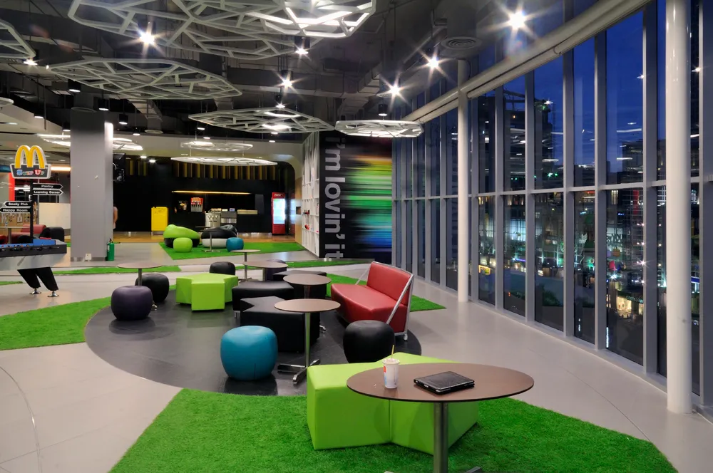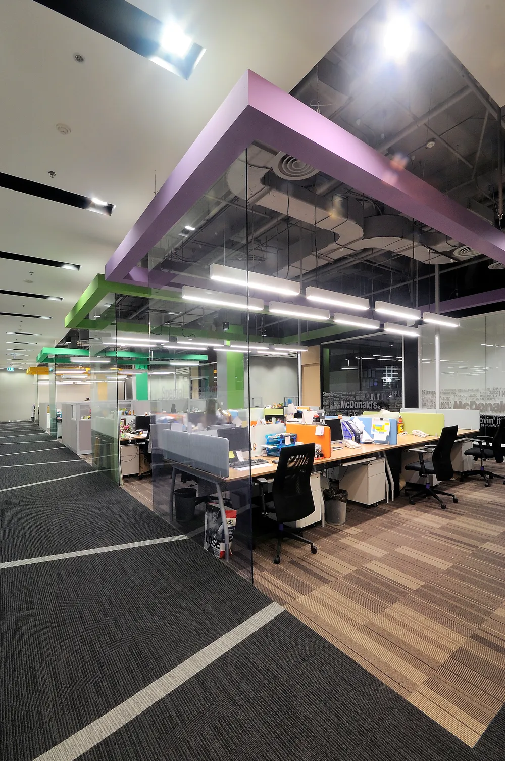 These elements flow throughout the entire office space, interacting in harmony to form a dynamic workplace. A spirited zest of energy introduced in all the different spaces immerses the users in a surprising, imaginative, and effective environment. McDonald’s looks after the welfare of their staff in an exceptional way. The diversity of backgrounds and personalities of the staff inspired the creation of different office-‘landscapes’ within the space. The colorful and lively open plan general work area combined amongst the offices, meeting rooms and open break out areas allows more interaction and communication among the staff. The casual communal spaces including the waiting area, pantry, and break out zones are designed to encourage staff bonding together and make them feel like home thus creating a sense of belonging.